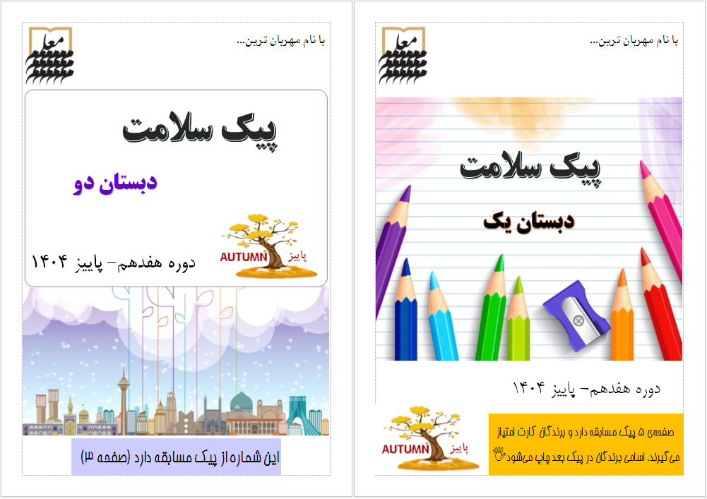 *** انتشار و توزیع پیک سلامت پاییزی برای دانشآموزان دبستانی؛ دانشآموزان پایههای اول تا ششم در همین ابتدای سال تحصیلی منتظر اولین شمارهی فصلنامهی خود باشند که همراه با مسابقه است و برندگان کارت امتیاز دریافت خواهند کرد.