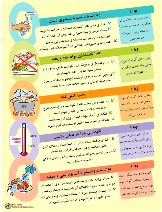 علت اصلی ایجاد آلودگی در آب و غذا در 5 مورد خلاصه میشود: عدم رعایت بهداشت در مراحل آمادهسازی غذا- آلوده شدن مواد خاممصرف یا قبلاً پختهشده با شیرابههای مواد خامی که هنوز پخته نشدهاند- مصرف غذایی که خوب پخته نشده- نگهداری مواد غذایی در دما یا فضای نامناسب- استفاده از مواد اولیهای که فاسد یا تاریخمصرف گذشتهاند (برای توضیحات بیشتر به تصویر توجه کنید)